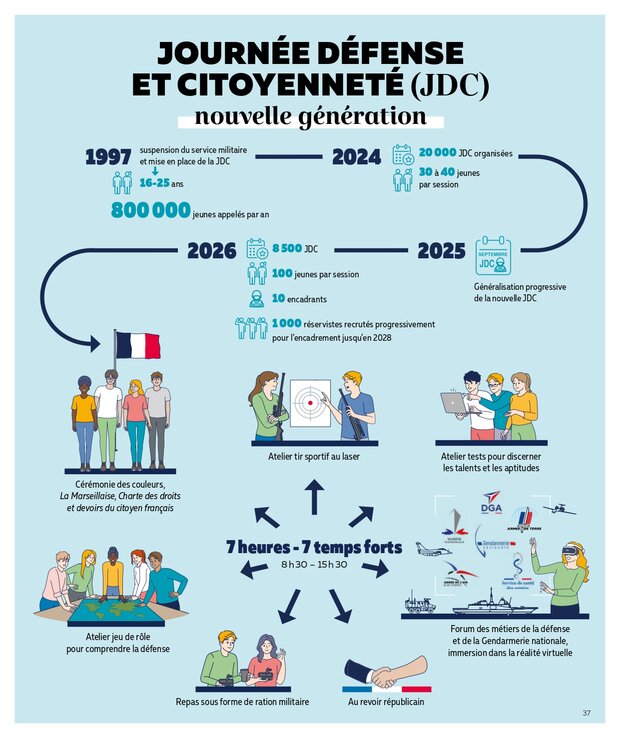 ➡ Retrouvez toutes les information sur la nouvelle JDC sur le site du ministère des armées : https://www.defense.gouv.fr/actualites/infographie-journee-defense-citoyennete-nouvelle-generation